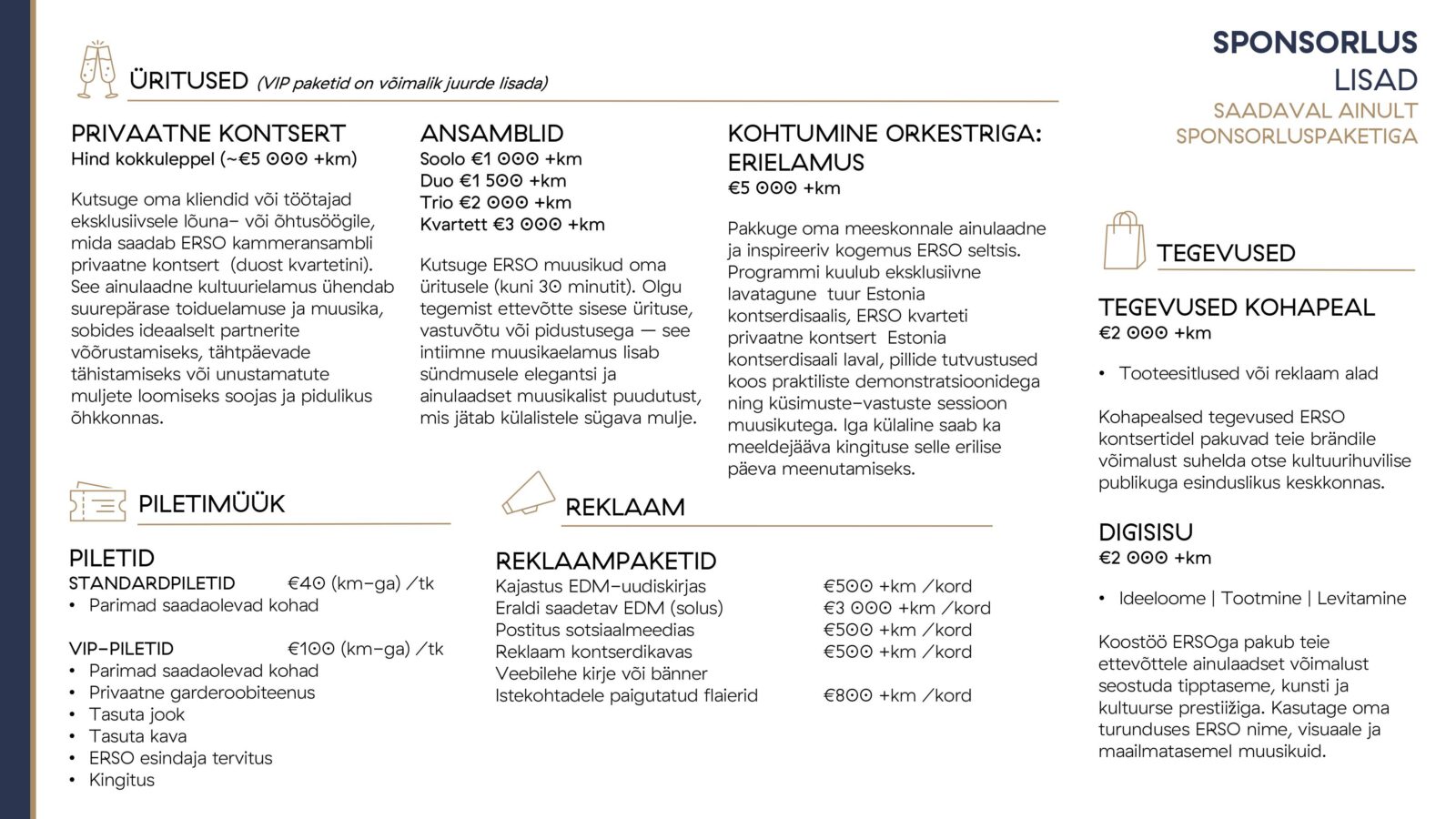 Võõrusta oma kliente, koostööpartnereid või töötajaid kontserdisaalis, pakkudes neile ligipääsu kontsertidele, proovidele ja eriüritustele.